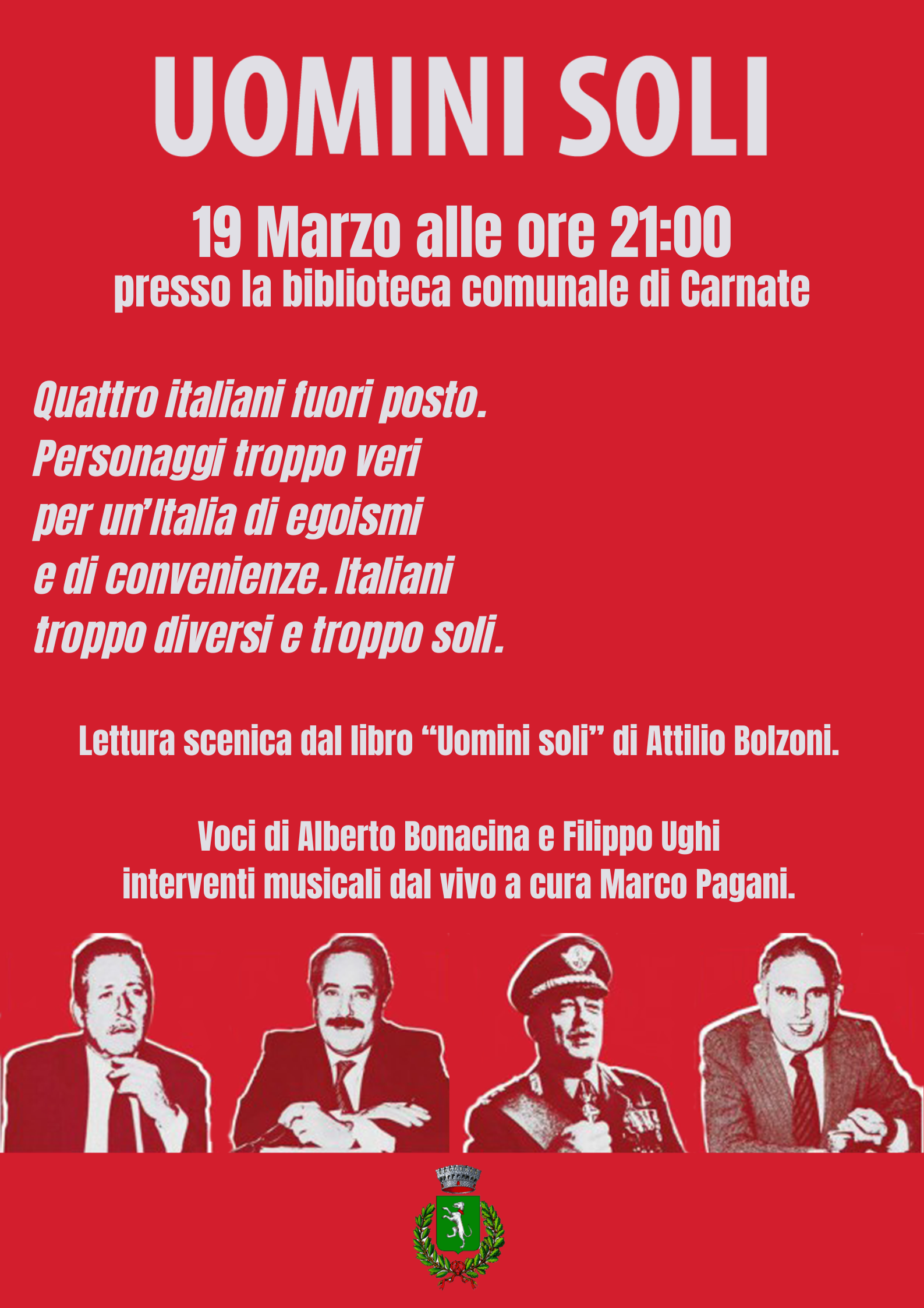Giovedì 19 Marzo 2026 alle ore 21:00, presso la Biblioteca Comunale ci sarà la lettura scenica dal libro "Uomini Soli" di Attilio Bolzoni.