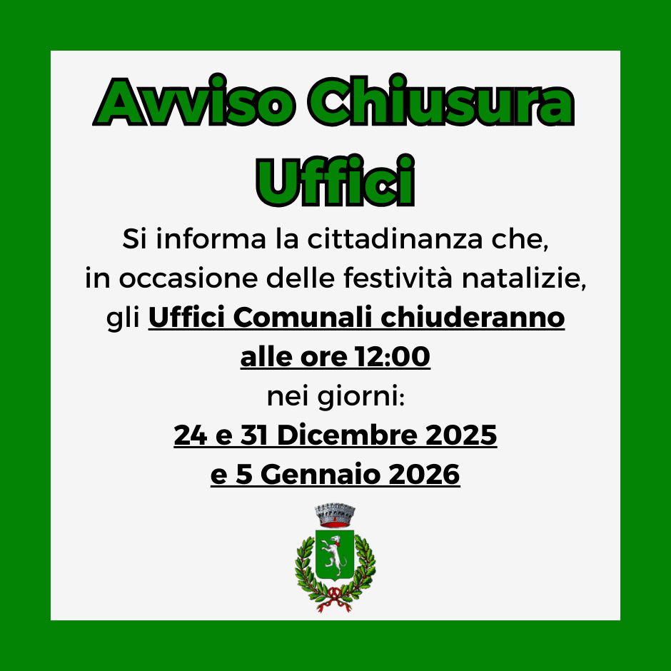 Si informa la cittadinanza che gli Uffici Comunali chiuderanno alle 12:00 nei giorni: 24 e 31 Dicembre 2025 e 5 Gennaio 2026.