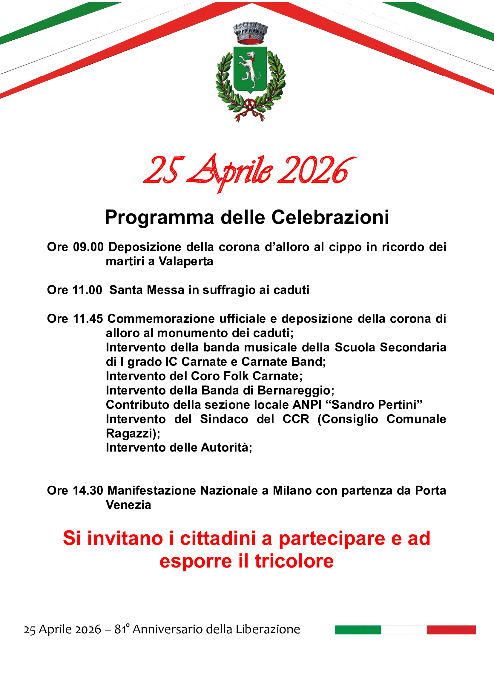 In occasione del 25 aprile, il Comune invita tutta la cittadinanza a partecipare alle iniziative organizzate per celebrare la Festa della Liberazione, per conoscere tutto il programma delle iniziative consultare l'allegato.