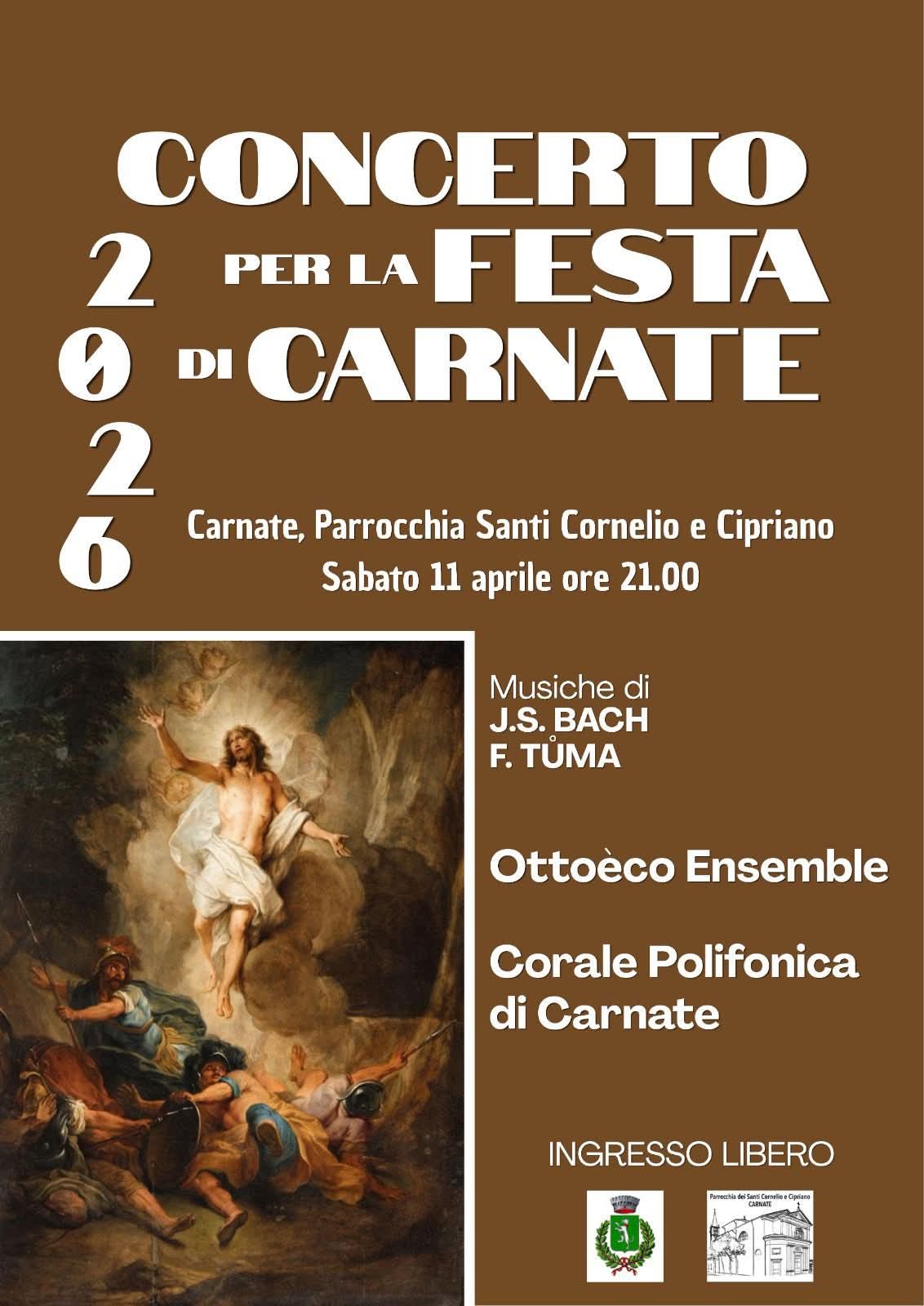 Sabato 11 Aprile 2026 presso la Chiesa dei SS Cornelio e Cipriano e Oratorio, si terrà il Concerto per la Festa di Carnate, con Ottoeco Ensemble e Corale Polifonica di Carnate.