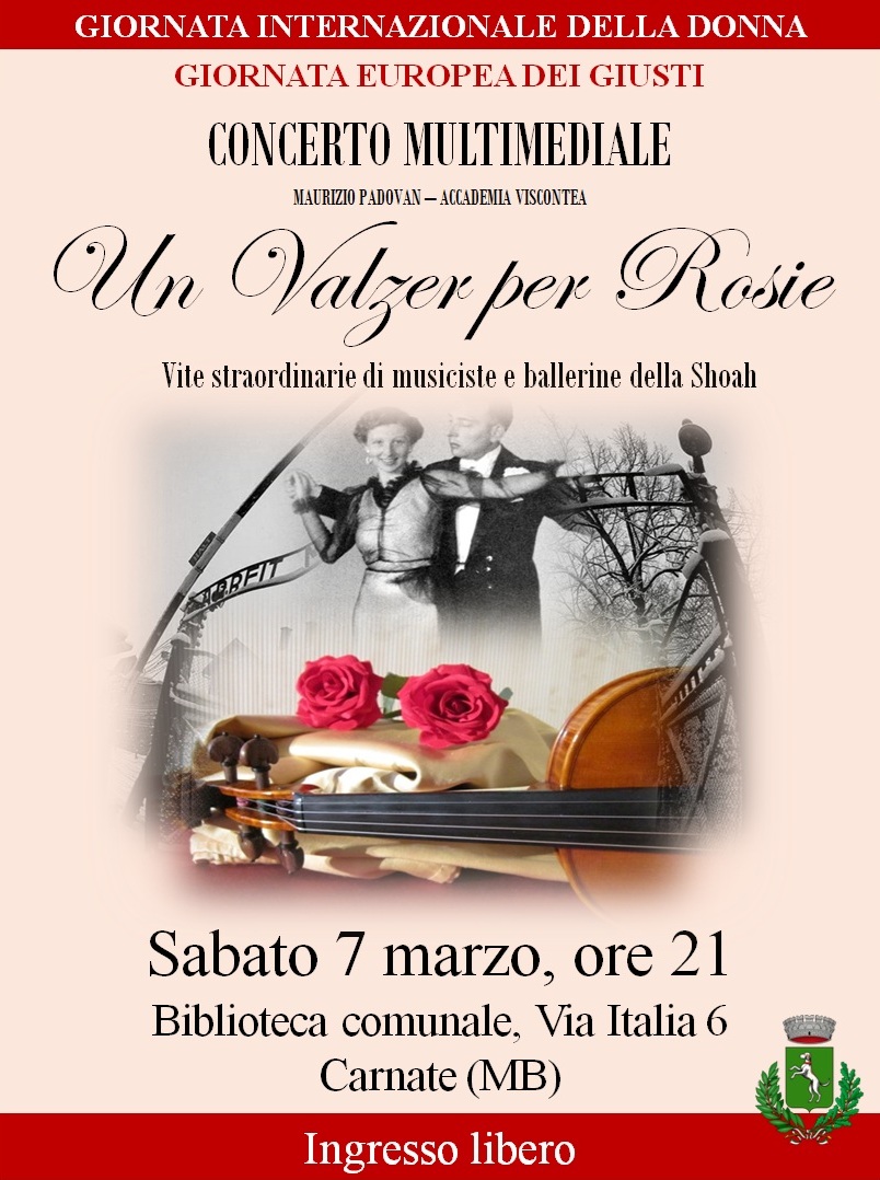 Sabato 7 Marzo 2026 alle ore 21:00, presso la Biblioteca comunale in via Italia 6, in occasione della Giornata Internazionale della Donna e della Giornata Europea dei Giusti, ci sarà "Un Vlazer per Rosie" un concerto multimediale sulle vite straordinarie di musiciste e ballerine della Shoah.