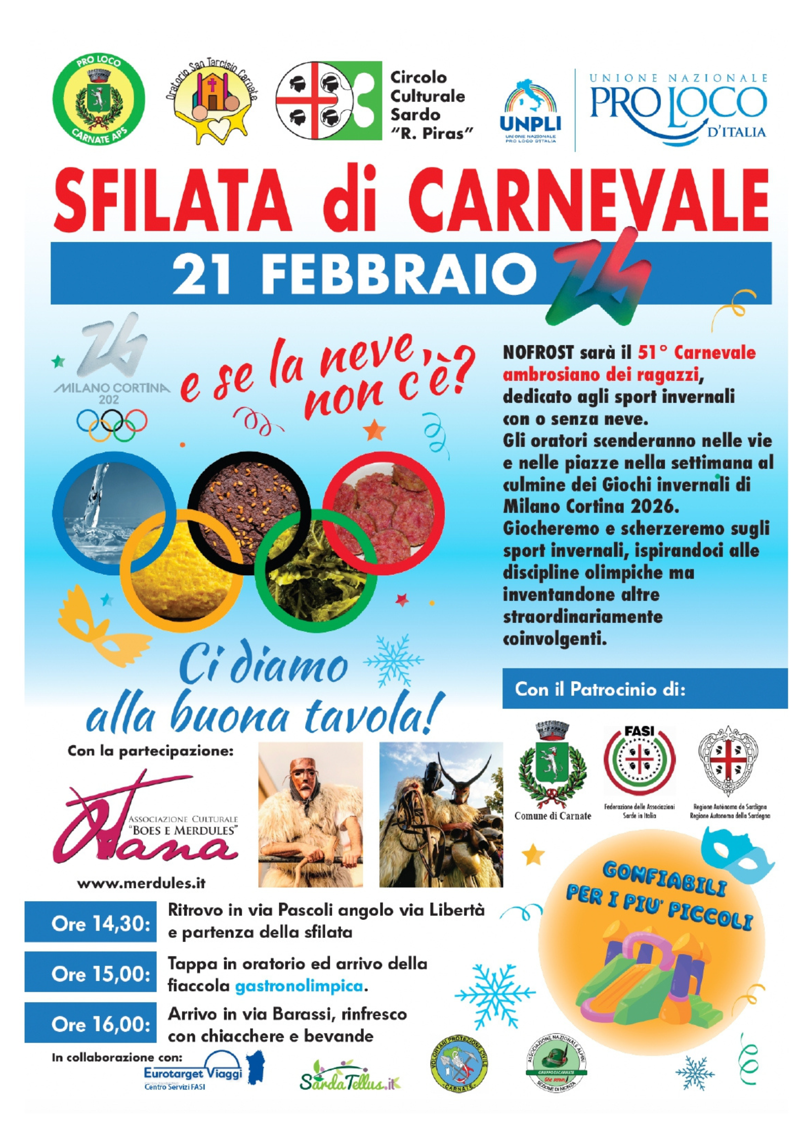 Sabato 21 Febbraio 2026 dalle ore 14:30 si svolgerà la "Sfilata di Carnevale" a Carnate con ritrovo in Via Pascoli angolo via Libertà e partenza della sfilata.