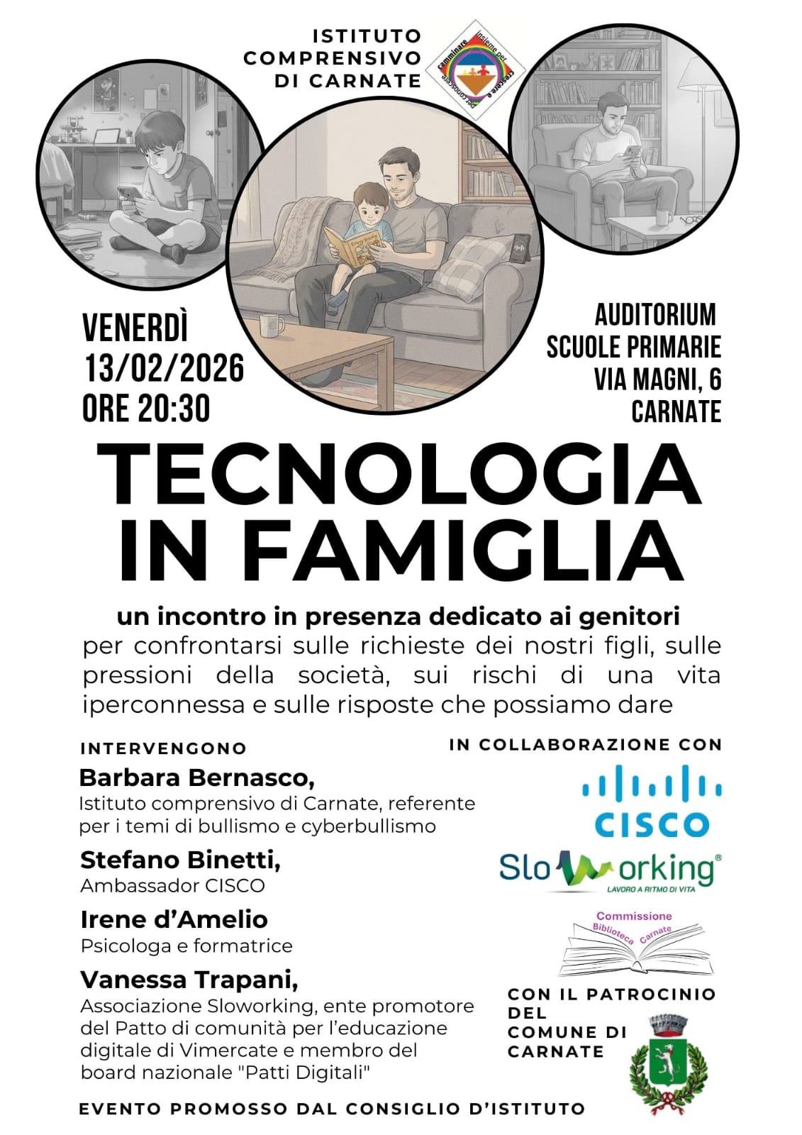 Il Consiglio di Istituto del IC a indirizzo musicale di Carnate organizza per il giorno 13 Febbraio 2026 alle ore 20:30, presso l'auditorium della Scuola Primaria, "Teconologia in famiglia".