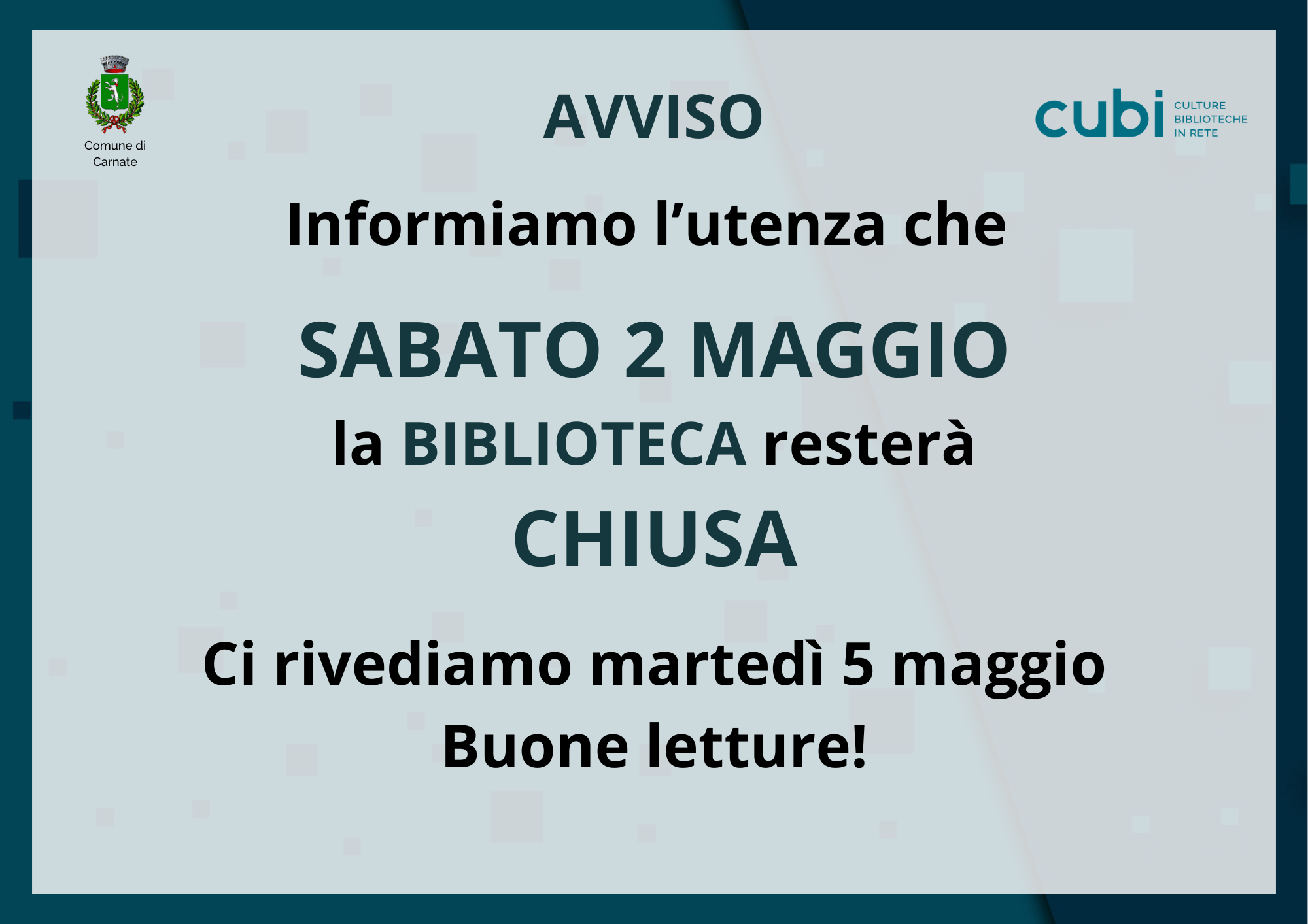 Si informano i gentili utenti che la Biblioteca sarà chiusa Sabato 2 Maggio, riaprirà direttamente Martedì 5 Maggio.